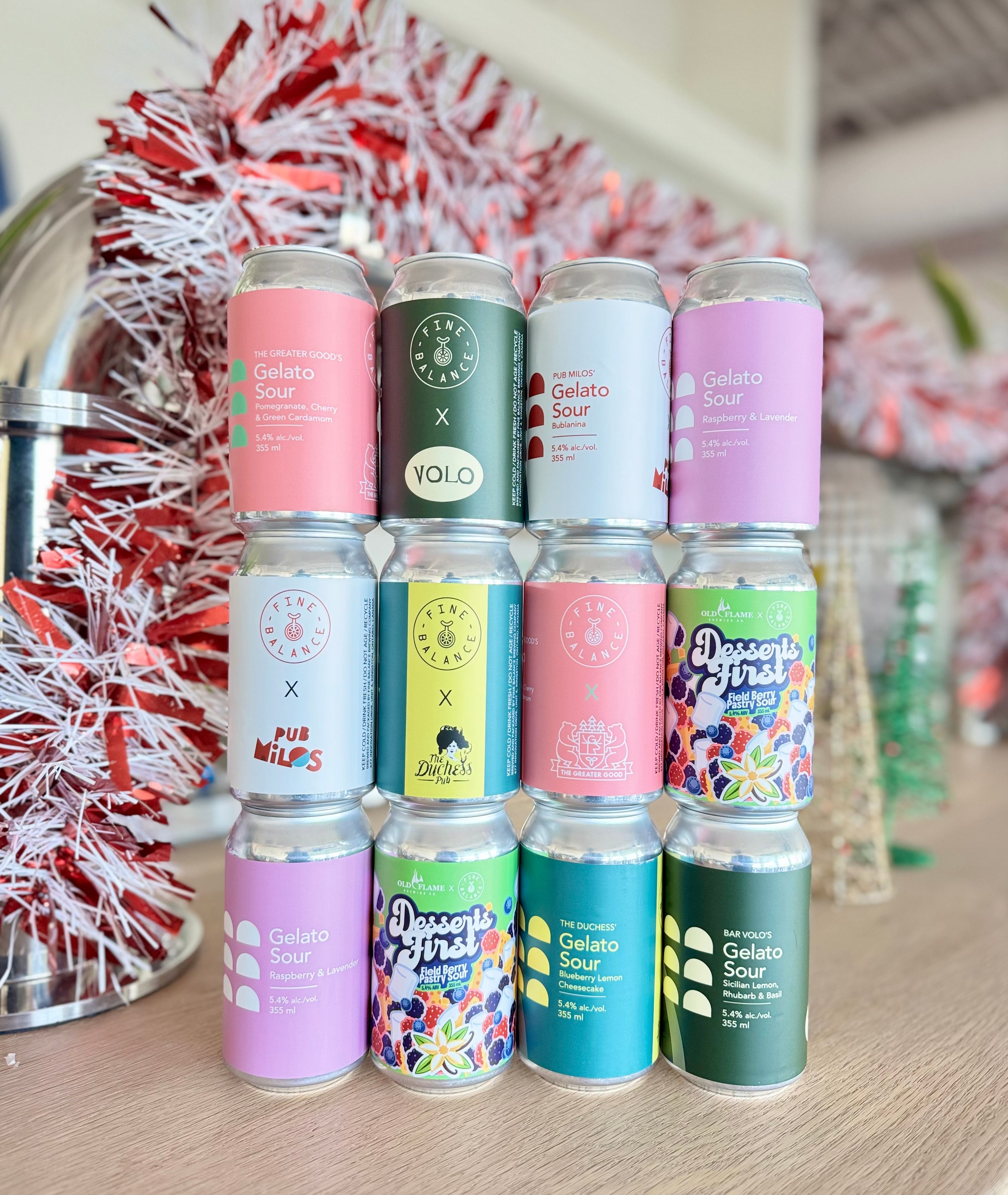Our Fruited Sour 12-pack includes: 2 Pomegranate, Cherry & Cardamom; 2 Sicilian Lemon; 2 Bublanina; 2 Blueberry Lemon Cheesecake; 2 Raspberry & Lavender; and 2 Desserts First Field Berry.