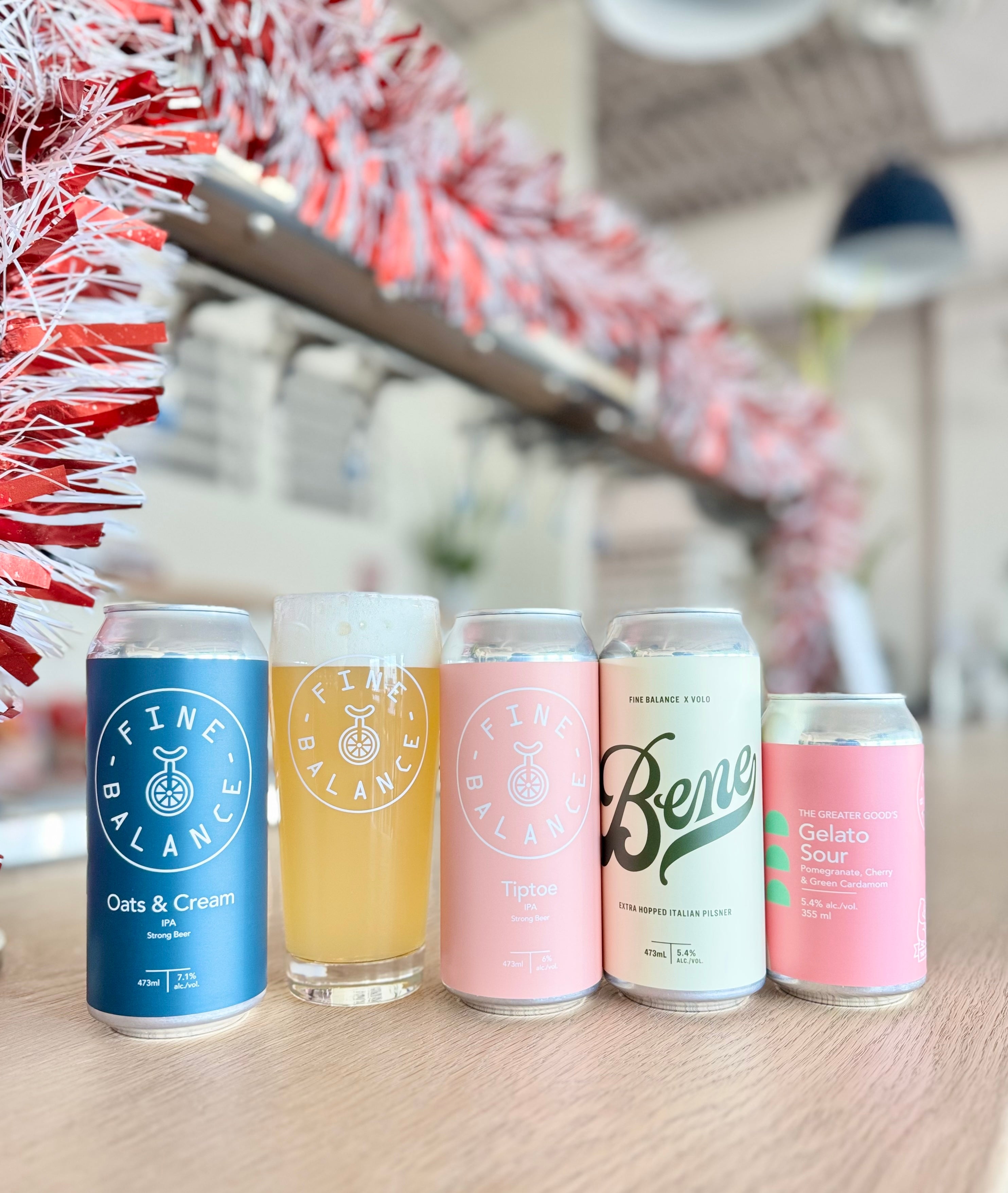 Our Mixed 4-pack with a glass includes: 1 Oats & Cream IPA; 1 Tiptoe IPA; 1 Bene Extra-Hopped Italian Pilsner; 1 Gelato Sour: Pomegranate, Cherry & Cardamom; and 1 16oz FB Pub Willi pint glass.