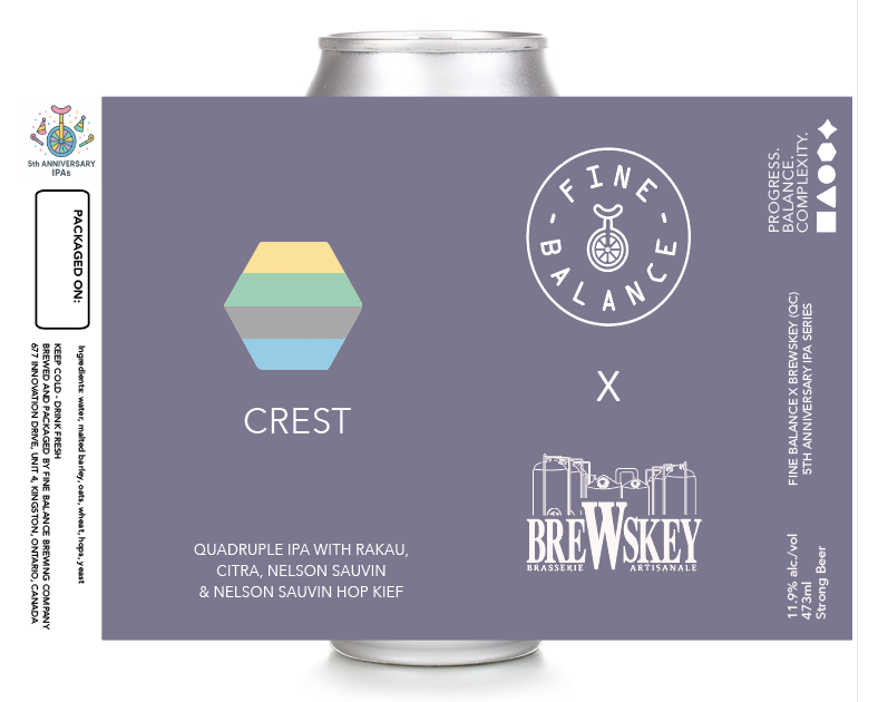 The fourth release in our anniversary IPA series is our first collaboration with Brewskey out of Montreal. Crest Qused IPA is a big beer, with a massive dry-hop of Freestyle Rakau, Citra, Nelson Sauvin, and Nelson Sauvin Hop Kief. It's too easy drinking, with notes of cantaloupe, honeydew mellon, and gooseberry, with a touch of dank.